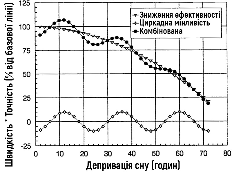 Депривація сну погіршує пильність, когнітивні функції та настрій. Здатність виконувати корисну розумову роботу знижується на 25% за кожні наступні 24 години неспання. Торн та ін. (1983) вивчали когнітивні функції військових за допомогою різних комп’ютерних тестів когнітивних функцій протягом 72-х годин повної депривації сну у здорових добровольців. Ці дані та їх аналіз представлені на рис.1. Дані про ефективність військових на рис.1 виражені як добуток швидкості та точності стрільби.