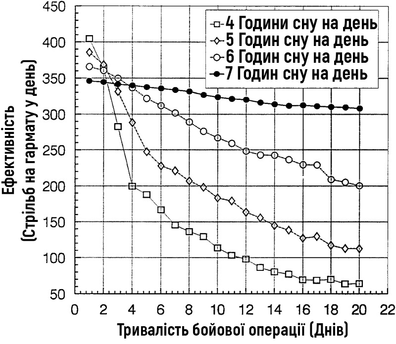 З рис. 2 очевидно, що навмисне обмеження сну з надією збільшити ефективність непродуктивне. Протягом 2-3 діб підрозділ, який менше спав, міг, через більший час роботи, точно навести більше снарядів за будь-яку добу, але після третьої доби їх ефективність падала до такого значення, що навіть з цим додатковим часом для роботи їхня ефективність була менше. Незважаючи на те, що бойовий розрахунок, який спав по 4 години щоночі, повинен був працювати по 3 години в кожен 24-годинний період, до третього дня стрільб їхня загальна ефективність за 24-годинний період була нижчою, ніж у розрахунку, який спав по 7 годин щоночі. Крім того, згідно з моделлю, сукупний обсяг випущених снарядів підрозділу продовжував падати з часом. Ці результати моделювання забезпечують якісну оцінку впливу часткового позбавлення сну на ефективність підрозділу протягом днів і тижнів безперервних бойових дій.